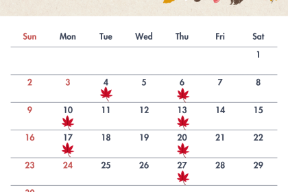 1日(月)2日(火)、3日(水)、9日(火)、11日(木)、15日(月)、18日(木)、21日(日)、22日(月)、25日(木)、29日(月)